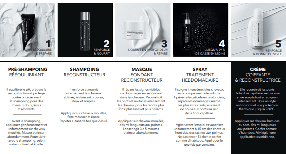 Pré-shampoing crème reconstructeur | Shampoing reconstructeur | Masque fondant reconstructeur | Spray | Crème de coiffage et de reconstruction | |
